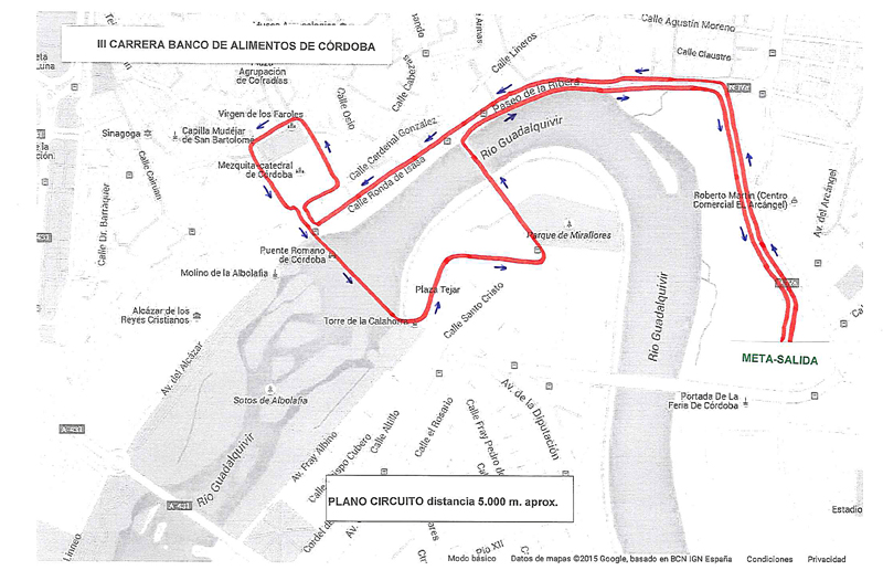 La prueba se disputar谩 sobre un recorrido de aprox 5.000 metros, totalmente urbano Pudiendo ir corriendo o andando. Salida del Balc贸n del Guadalquivir- Ronda de los M谩rtires 鈥 Ronda de Isasa 鈥 Puerta del Puente 鈥 Cardenal Gonz谩lez鈥 Torrijos 鈥 Puerta del Puente 鈥 Puente Romano 鈥 Bajada del puente 鈥 Acera del Arrecife 鈥 Puente de Miraflores 鈥 Ronda de los M谩rtires 鈥 Balc贸n del Guadalquivir Meta.